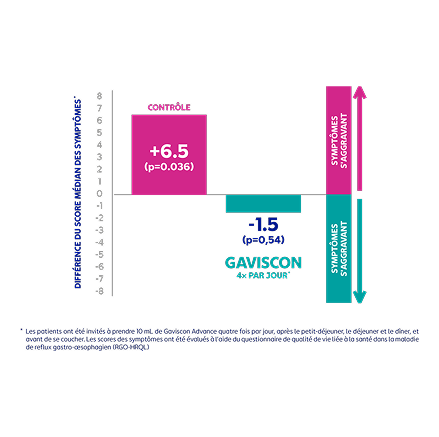 Consulter l'étudeLa prise de Gaviscon 4 fois par jour permet de réduire significativement les symptômes à l’arrêt des IPP 11